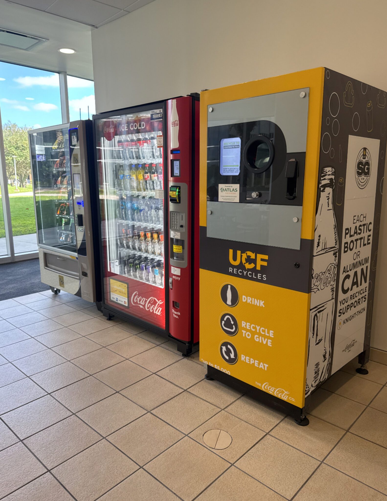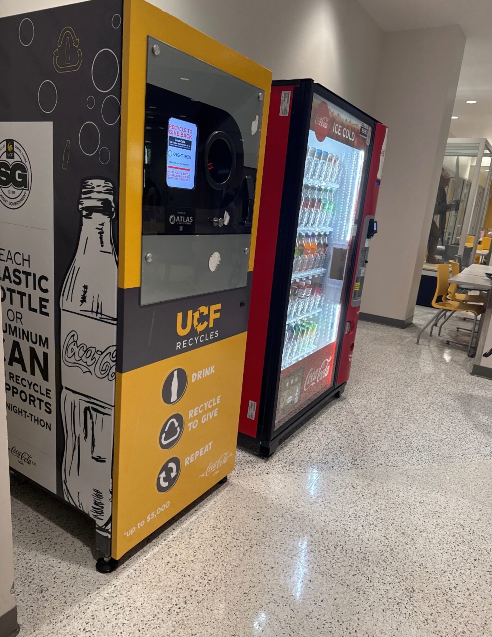 When on campus, consider recycling your plastic bottles and aluminum cans at a Coca-Cola Reverse Vending Machine! There are two RVM locations on campus: the Student Union dining area (left) and the Teaching Academy on the first floor (right). Coca-Cola donates 5 cents to Knight-Thon for each item recycled!